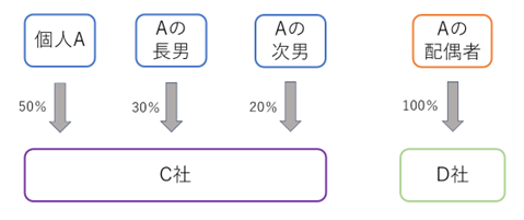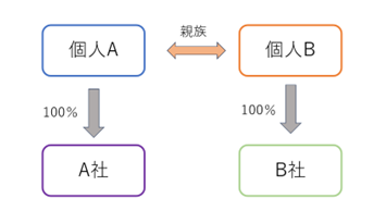 ※A社とB社の間には、同一の者による完全支配関係があります。法人の発行済株式等を保有する者が個人である場合には、個人及びその親族等が「一の者」とされています。この場合の「親族」の範囲は広く、法人税法で規定される「同族関係者」(6親等内の血族、配偶者、3親等内の姻族)が含まれます。