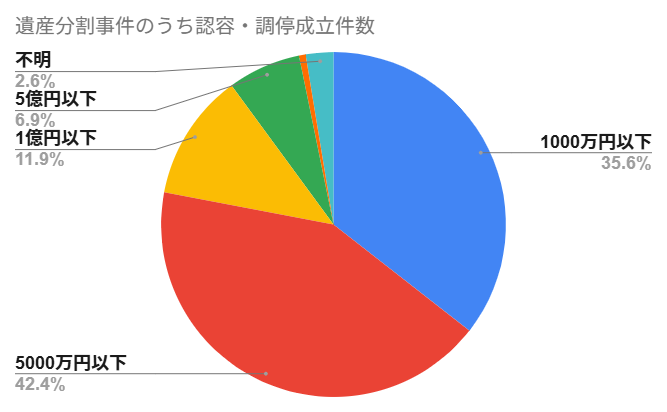 遺産分割トラブルの対策は、相続税が発生しない場合でも必要です。相続トラブルと聞くと、財産がたくさんある家庭で、発生するイメージがあるかもしれません。しかし、裁判所による司法統計のデータ(下図参照)を見ると、遺産分割調停の件数は、遺産の金額が1000万円以下のケースで約35%を占めています。さらに、5000万円以下まで含めると78%です。