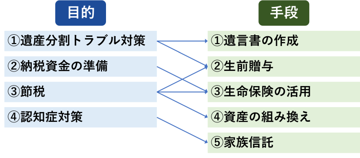 以上、ここまであげた、生前対策の目的と、具体的な手段5つを整理しておきます。このほかにも、数多くの手段がありますが、ここにあげたのは、主要なものだけであることをご了承ください。