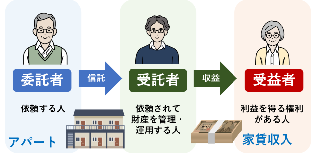 「委託者」、つまり、依頼する人が、自分の財産(「信託財産」)、たとえば、賃貸アパートを、「受託者」に託します。受託者とは、依頼されて、そのアパートの運用や管理をする人です。そして、アパートの家賃収入は、「受益者」のものになります。