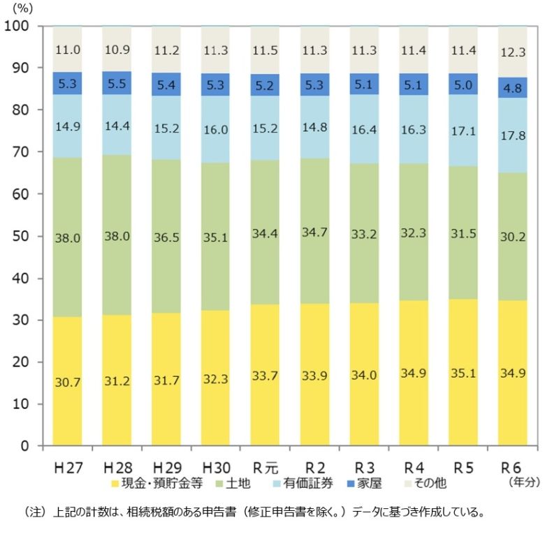 【出典】令和6年分 相続税の申告事事績の概要 「5相続財産の金額の構成比の推移」|国税庁