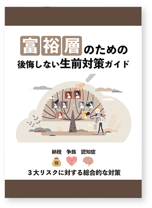 | 「富裕層のための後悔しない生前対策ガイド」(A4版PDF 26ページ) 相続の生前対策は、「何から始めればよいか分からない」と迷いやすいテーマです。 特に、資産が数億円規模になると、不動産や自社株など、分けにくい資産が含まれやすくなります。 生前対策として必要な対策の全体像を把握し、優先順位を整理するために、わかりやすく解説したリーフレットを作成いたしました。 「納税対策」「争族対策」「認知症対策」などに役立つ資料となっております。 富裕層のための後悔しない 生前対策ガイド |